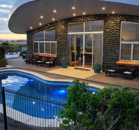 A truly unique property with unobstructed views out across Doubtless bay and beyond, this architectural masterpiece features solid concrete construction throughout, with high stud ceilings and extensive use of large windows and sliders opening out onto the enclosed inground pool area to the east. The massive decked area to the west enjoys the stunning vistas of both the coast and the sunsets.